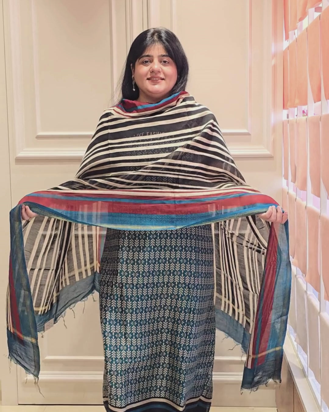 A perfect blend of ethnic block print on pure handcrafted Maheshwari silk fabric. Kurta length 2.5 m approx, bottom length 2.5m approx , dupatta length 2.5 m approx
