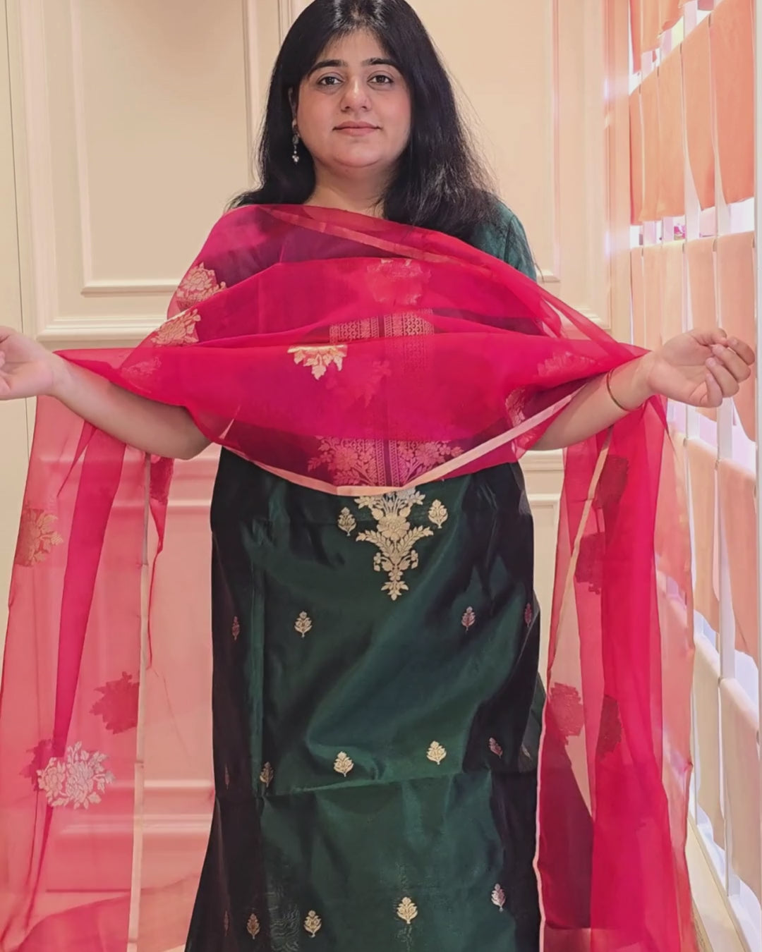Pure Handloom kataan silk with kadwa sona zari work , katan silk bottom with stripes border pattern and kora organza full zari buti dupattta with border. Kurta length 2.75 m approx, bottom length 2.5m approx , dupatta length 2.5 m approx