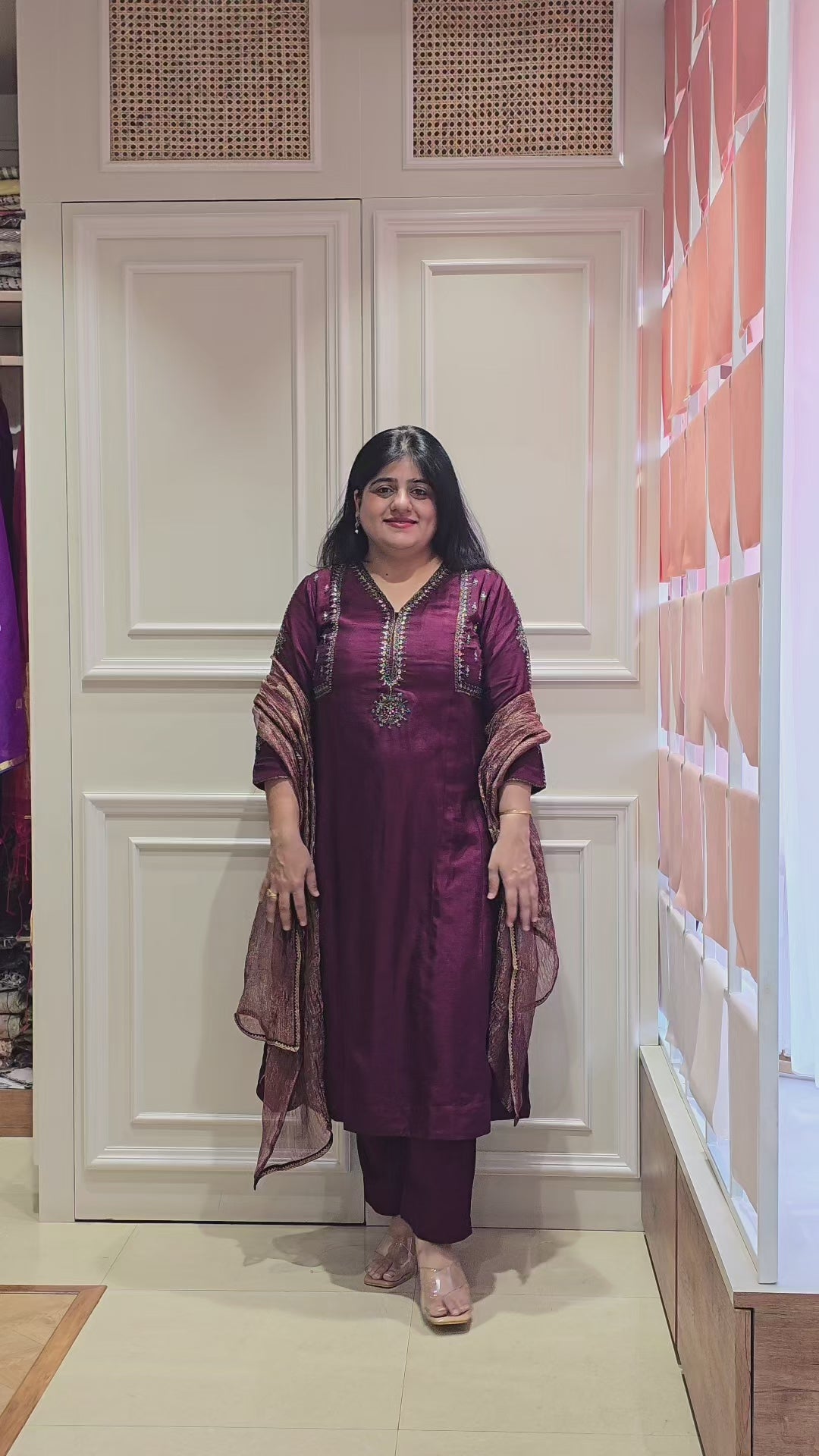 Silk base kurta with subdued handwork detailing on the yolk. Tissue dupatta and straight pants.